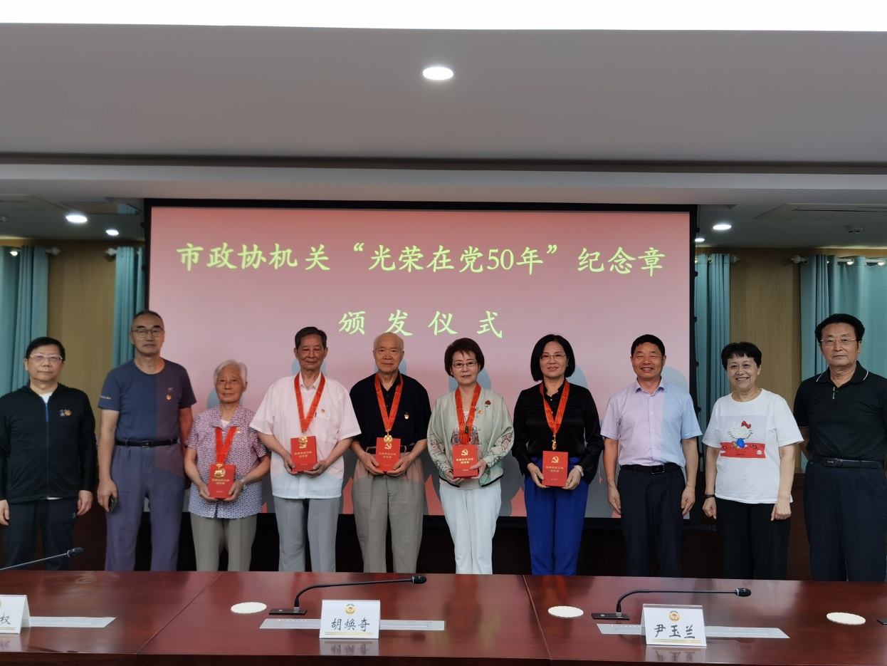 为进一步增强老党员的荣誉感,同时激励广大党员“不忘初心、牢记使命”, 6月30日上午,市政协机关在委员活动中心举行了庄重简朴的仪式,向胡焕奇、尹玉兰、吴曾权、伏俊怀、杜飞云5位老党员集中颁发了“光荣在党50年”纪念章。市政协办公厅主任薛维国主持颁发仪式并讲话。