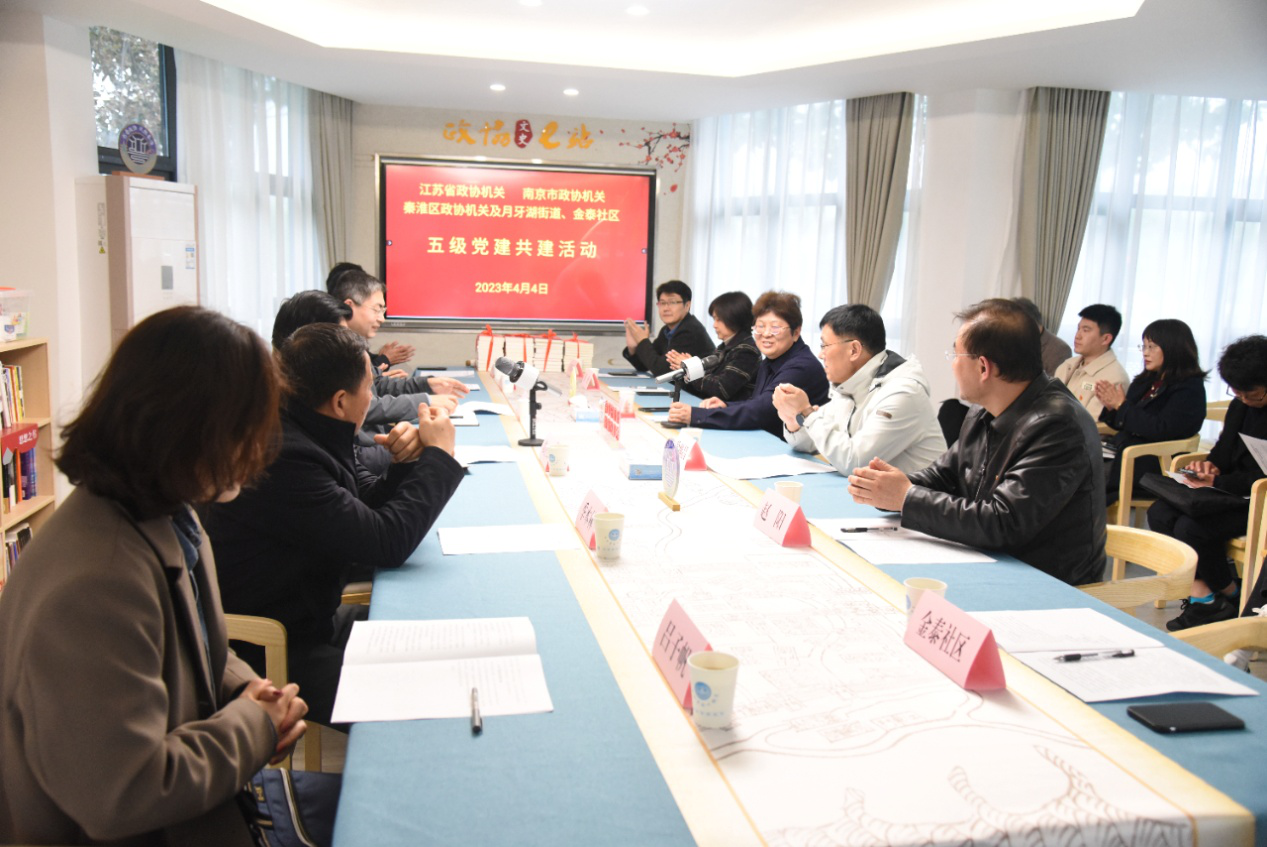 4月4日,江苏省政协机关、南京市政协机关、秦淮区政协机关及月牙湖街道、金泰社区五级党组织在秦淮区月牙湖街道御水湾小区“梧桐语政协书屋—便民服务驿站”,开展共学共建活动。