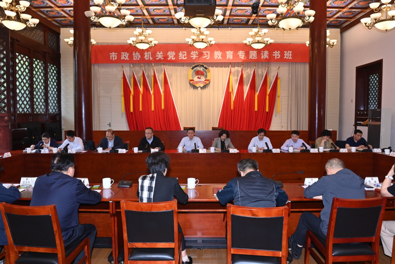 专题读书班采取集中学习与个人自学、辅导解读与交流研讨相结合的方式进行。5月11日,举行市政协机关党组、各专委会分党组理论学习中心组学习交流会,围绕《条例》总则部分及党的政治纪律、组织纪律进行深入交流。大家结合思想和工作实际讲体会、谈打算,一致表示将坚持示范带头,拓展学习成果,发挥模范引领作用,坚持全面学与专题学、反复学与及时学、集体研讨与个人自学相结合,在学习党纪、理解党纪、执行党纪上起到表率作用,持续营造党纪学习浓厚氛围,推动党纪学习教育走深走实。坚持问题导向、持续整改提升,在学习同时对照《条例》查摆自身存在问题,从各级查处的严重违纪违法典型案例中汲取深刻教训、划清原则界限,以自我革命、刀刃向内的勇气开展检视剖析,深入排查廉政风险点,使廉洁自律规范内化于心、外化于行。坚持学用结合、做到知行合一,持续通过真学、深学、常学,带动广大党员形成创先争优的正气和崇尚实干的风气,让压力层层传导、动力逐级传递、活力持续释放,在强化纪律意识中增强做好工作的积极性、主动性,切实把党纪学习教育激发出来的工作热情,转化为带班子、管队伍、服务政协高质量履职的实际成效。