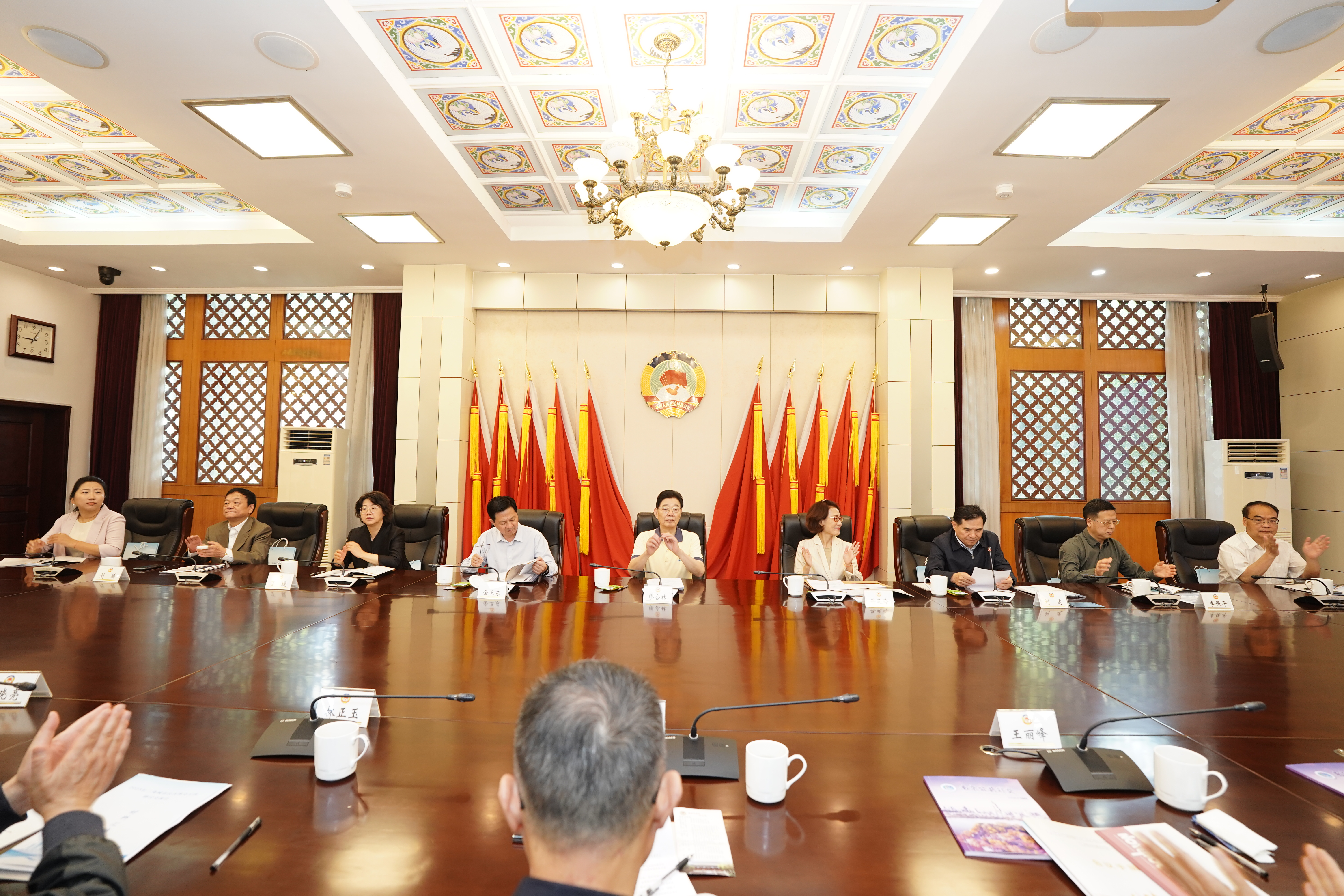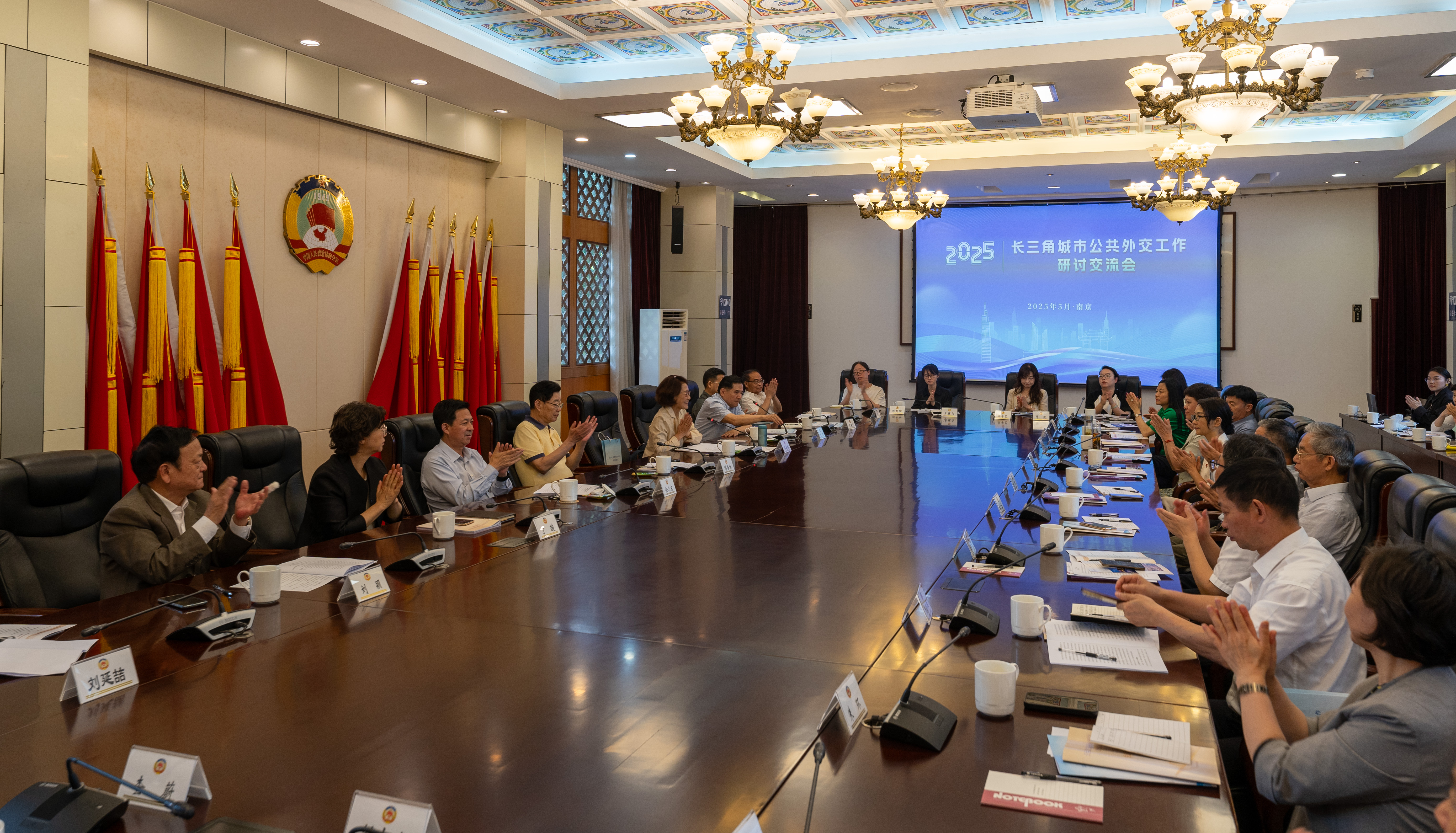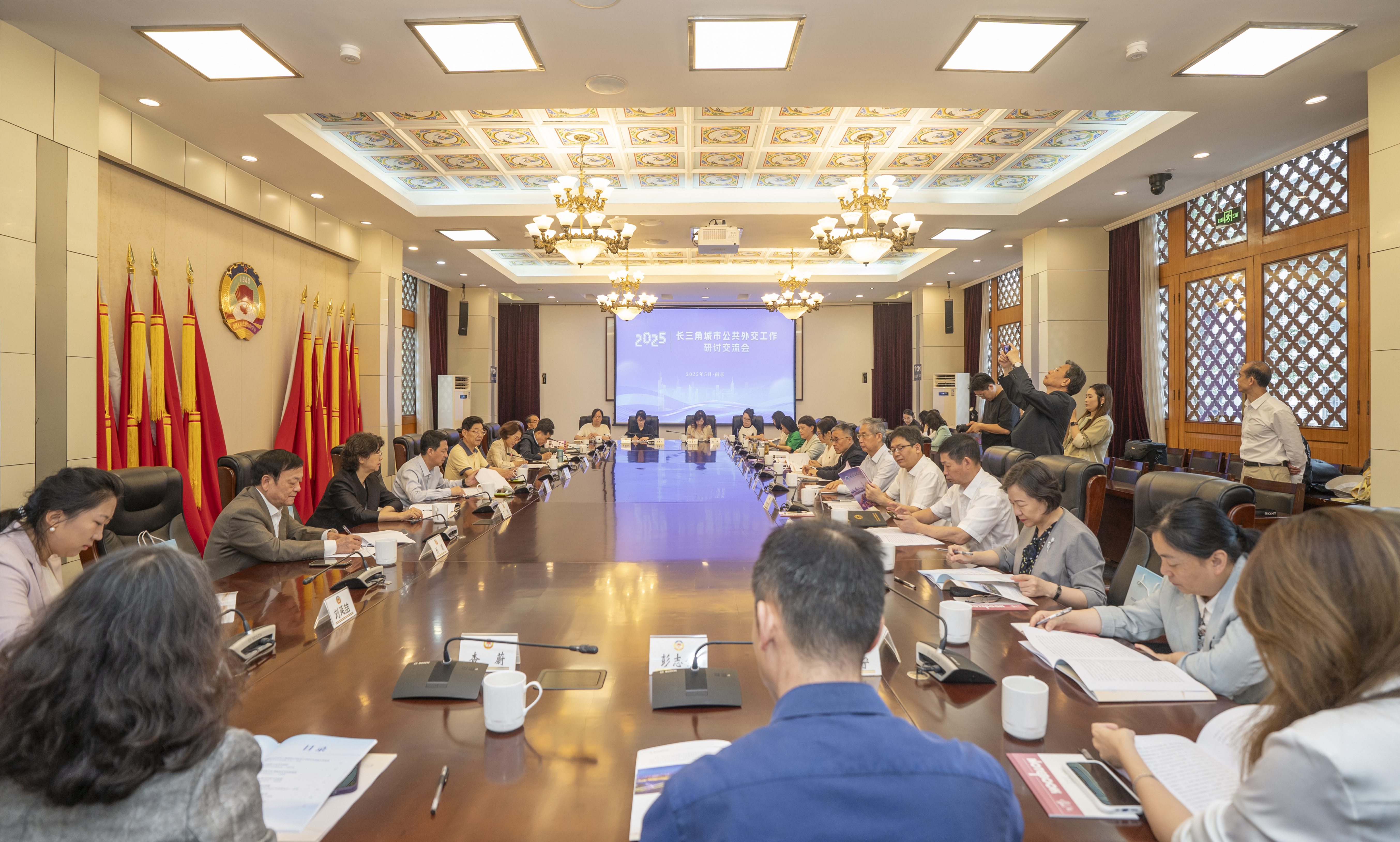 5月24日,2025长三角城市公共外交工作研讨交流会在南京市政协议政堂召开。市政协副主席金卫东、中国公共外交协会佟晓玲大使出席会议并讲话,十二届南京市政协主席、南京公共外交协会会长缪合林,十二届南京市政协副主席、南京公共外交协会常务副会长刘建,市政协副秘书长丁璇,港澳台侨和外事委员会主任李保平,长三角兄弟市县政协和公共外交协会的领导及同仁等三十余人参加会议。