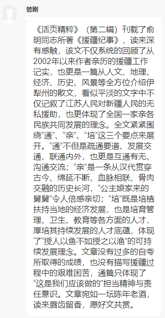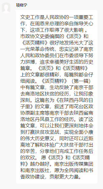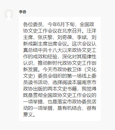 本次委员线上读书交流活动中,李奇副主席为教卫体(文化文史)委员会全体委员推荐的阅读书目是《南京市政协文史资料·活页精粹》第一辑和第二辑。李奇强调,近年来市政协教卫体(文化文史)委员会以征编《活页》的方式,坚持不懈地致力于“三亲”史料的耕耘,收获颇丰。本届市政协对已编发的《活页》进行整理,并选其优秀、辑其菁华,冠以“活页精粹”之名公开出版,为我市政协文史资料工作增添了浓墨重彩的一笔。两本文史书籍共收录了40余位政协委员、政协工作者的“三亲”文章,具有很强的思想性、可读性、资料性和收藏性。教卫体(文化文史)委员会组织的此次线上委员读书活动,选择阅读交流本届市政协出版的两本文史书籍是将贯彻落实全国政协文史工作座谈会精神和落实市政协委员读书活动的有机结合,是落实汪洋主席“要充分利用委员读书、委员讲堂等履职活动,加强文史工作成果转化,增强社会效应”要求的创新举措。