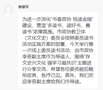 7月22日,市政协李奇副主席带领教卫体(文化文史)委员会全体委员举行了“存文史兴文化 强学习凝共识”委员线上读书交流活动。在此次活动中,李奇副主席担任导读人,教卫体(文化文史)委员会主任李保平担任主持人。