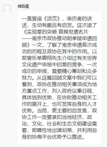成伯清委员分享《实现零的突破 首拥世遗名片——南京市政协推动明孝陵申遗回顾》