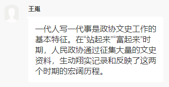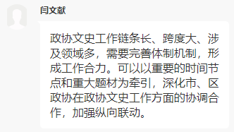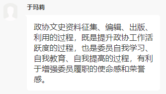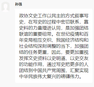 教卫体(文化文史)委副主任、一级巡视员孙强,副主任王嵬、闫文献、朱京芝、于玛莉参加了本次活动,与委员们交流做好政协文史工作的体会。
