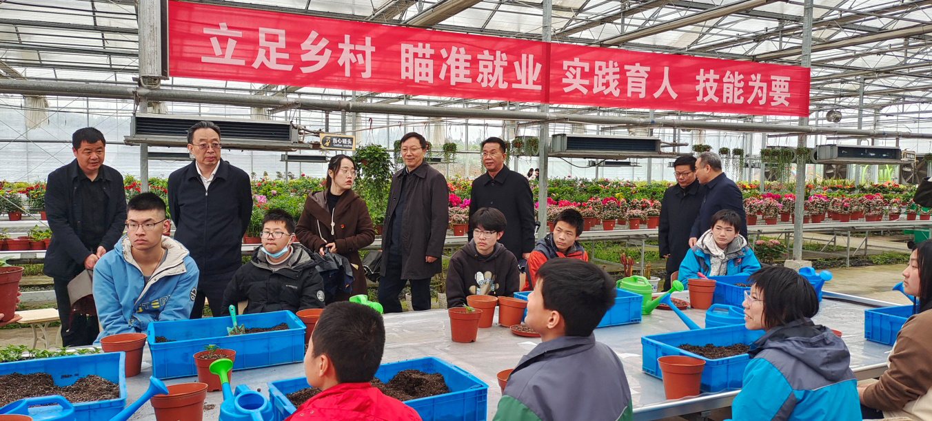 调研组一行观摩基地自强园现场教学,与师生互动交流,了解该校2008年2月创办以作物生产技术为主要专业的职业中专,探索实践“教育-培训-就业”一体化办学的经验做法。2017年4月,《提升残障学生生活质量的教育、培训、就业、康复一体化办学模式》项目被江苏省教育厅确认为基础教育前瞻性教学改革实验一类项目,2020年获省教学成果一等奖。