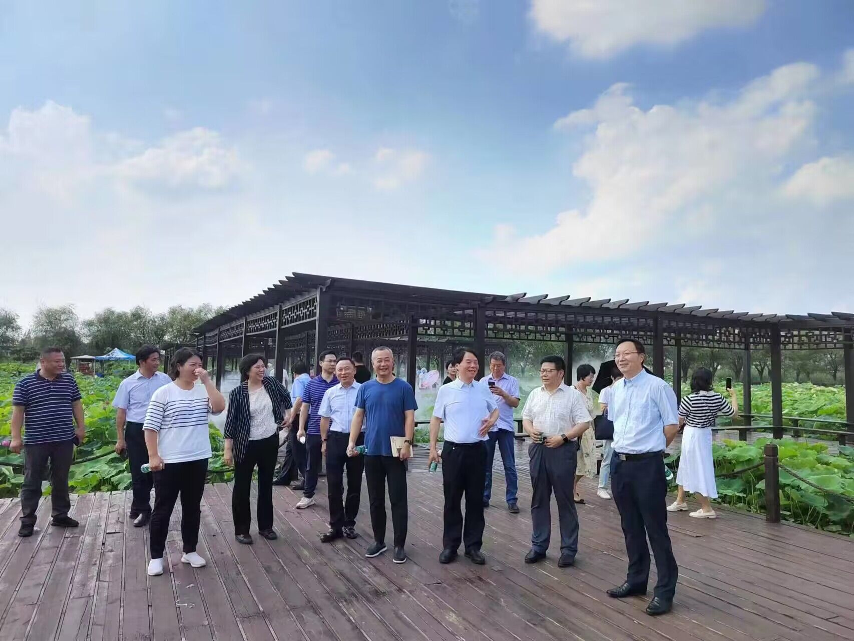 调研组一行首先来到南京“水一方”生态休闲旅游区进行实地调研。南京“水一方”生态休闲旅游区位于龙潭街道陈店村,2014年开园,规划面积7.34平方公里,核心区面积3.9平方公里。李奇对龙潭街道以1.1万亩农用地整治为契机,成功打造“水一方”独具南京水乡特色的赏荷景区的做法表示肯定。他建议进一步发掘龙潭古镇500年历史的文化内涵,利用周边水陆交通便利、自然环境优美的优势,进一步吸引游客,加快推动休闲农业和高效农业产业发展,促进农民增收,推进一二三产业融合发展。