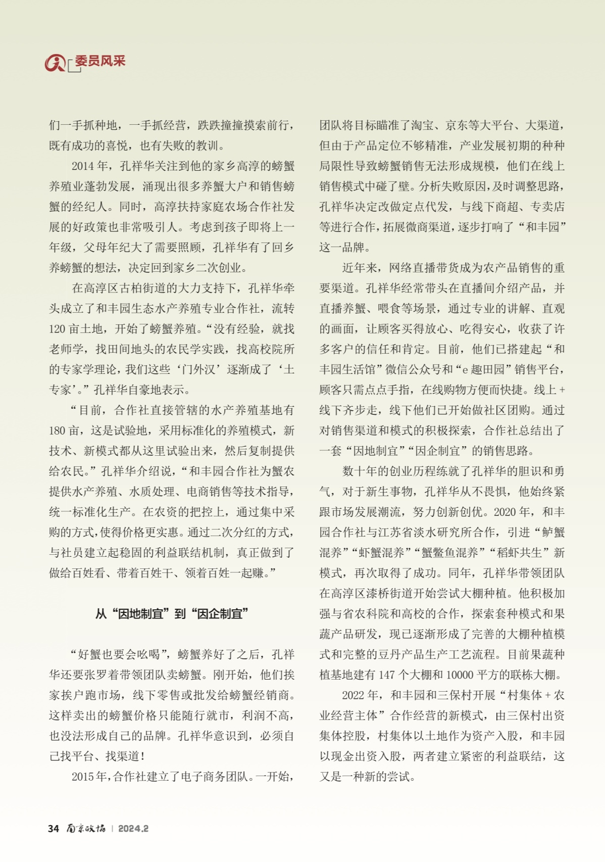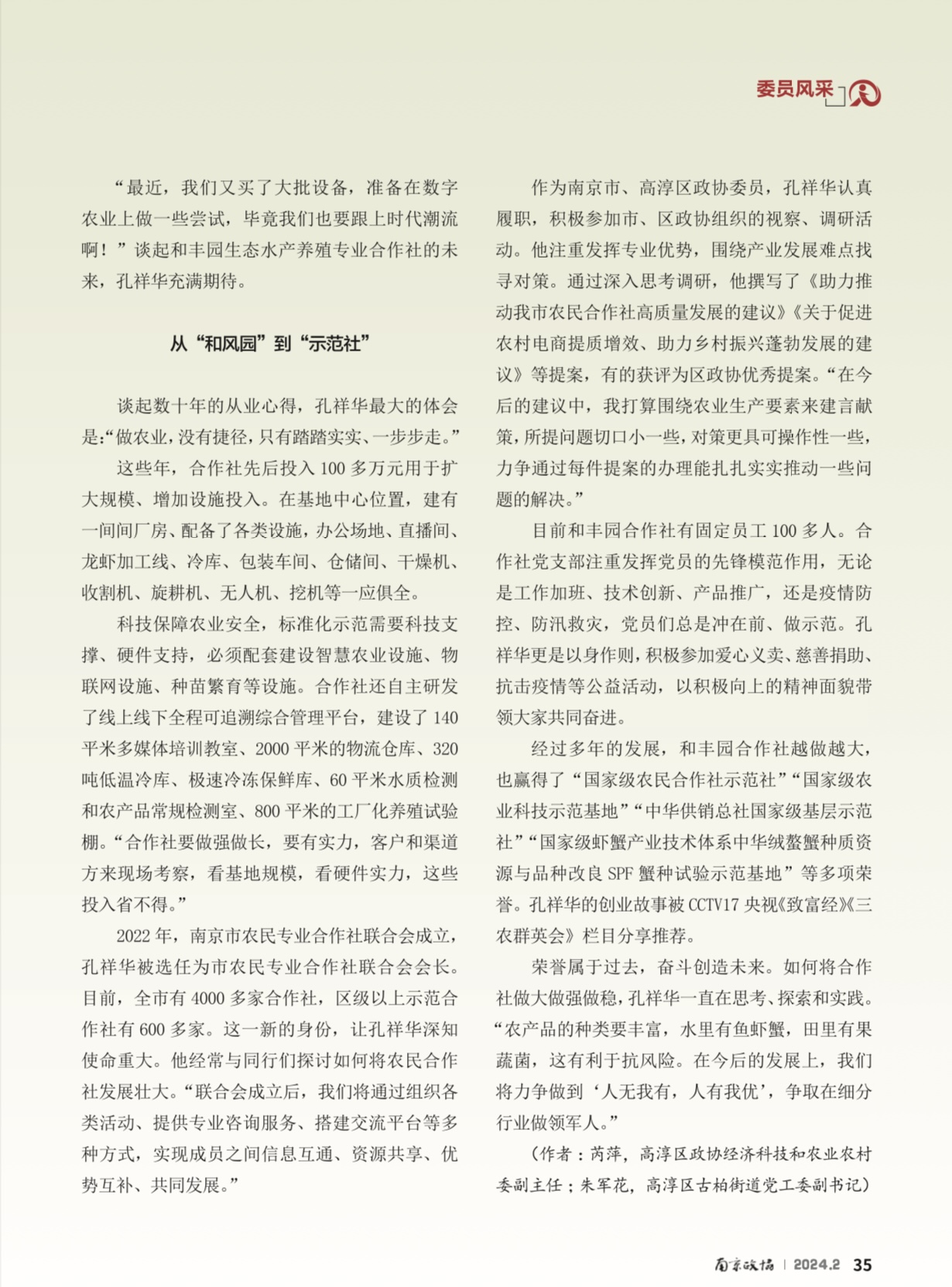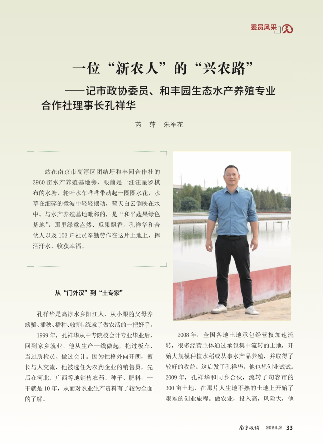 站在南京市高淳区团结圩和丰园合作社的 3960亩水产养殖基地旁,眼前是一汪汪星罗棋 布的水塘,轮叶水车哗哗带动起一圈圈水花,水 草在细碎的微波中轻轻摆动,蓝天白云倒映在水 中。与水产养殖基地毗邻的,是“和平蔬果绿色 基地”,那里绿意盎然、瓜果飘香。孔祥华和合 伙人以及103户社员辛勤劳作在这片土地上,挥 洒汗水,收获幸福。