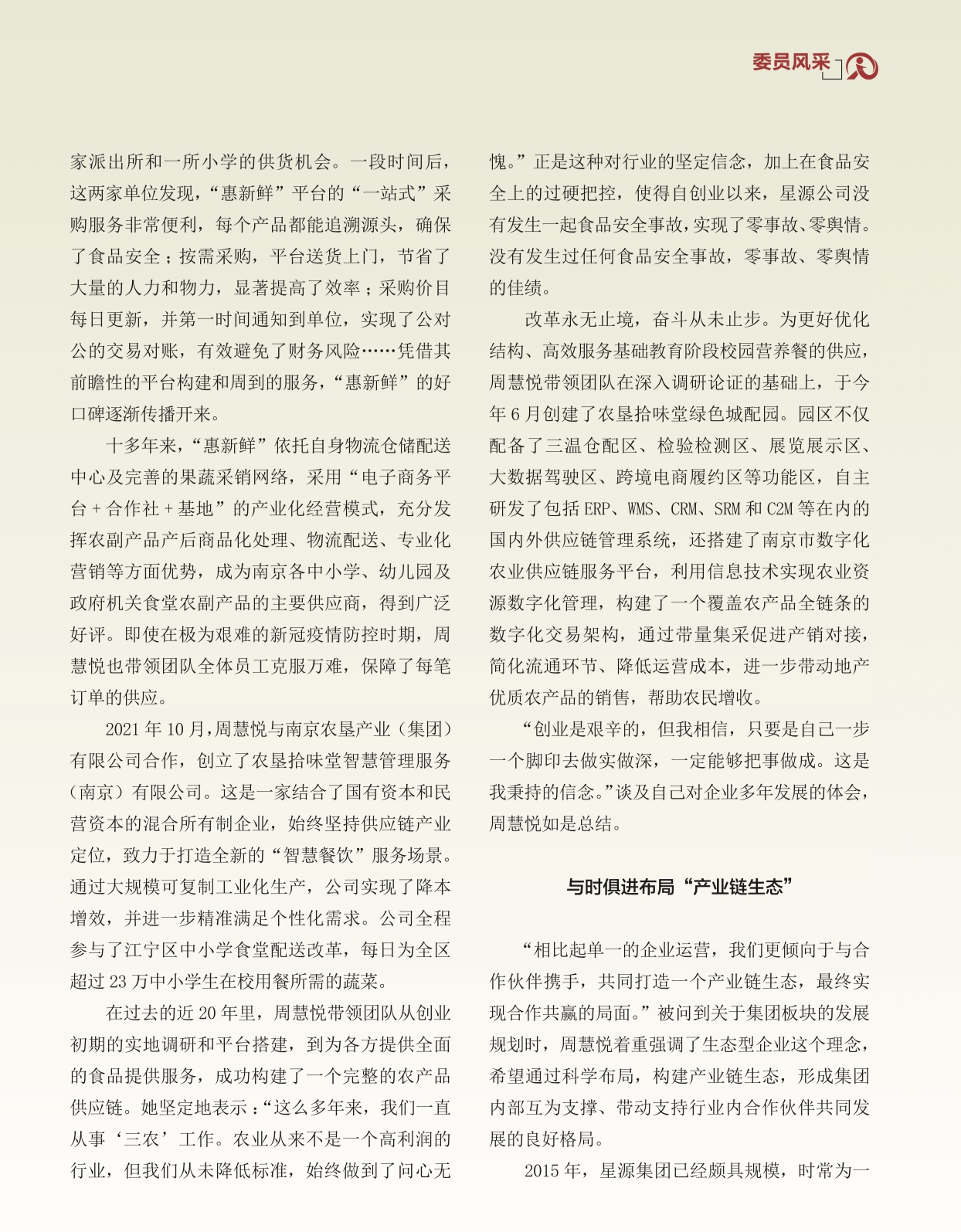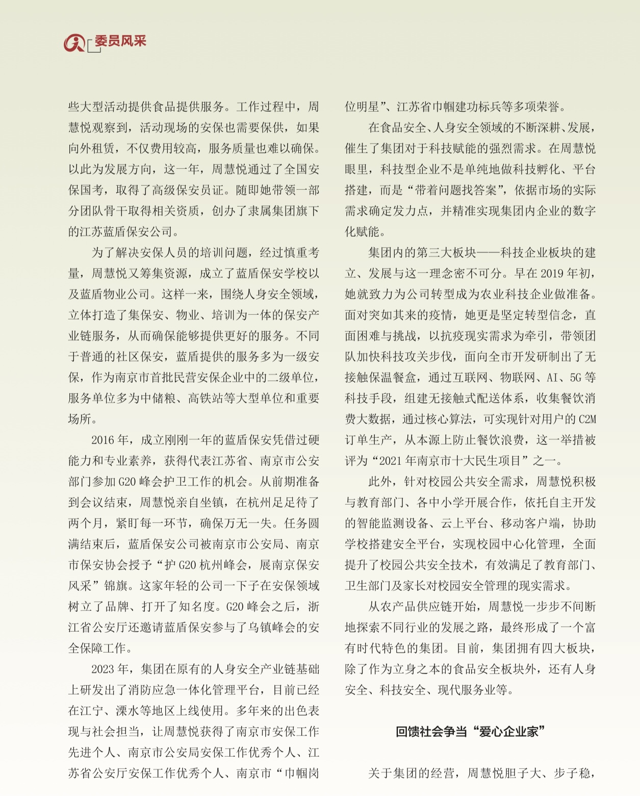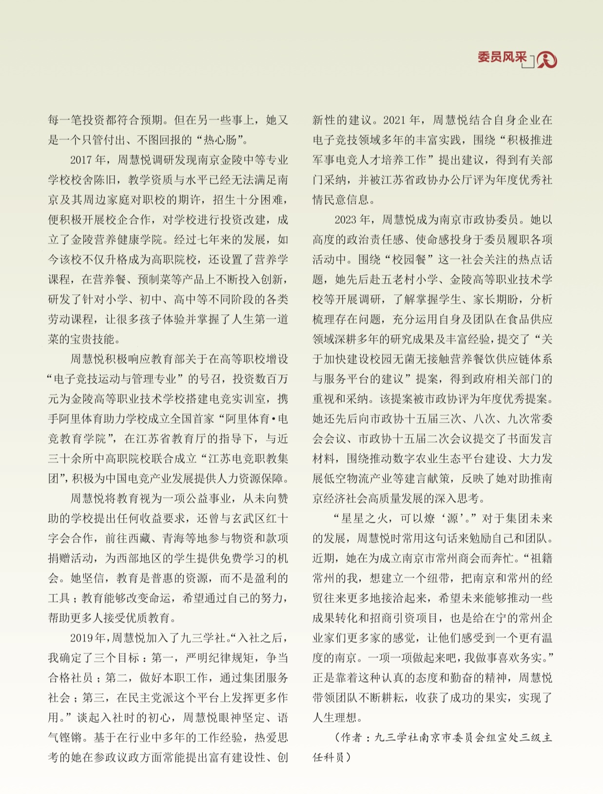 说到金陵营养健康学院,不得不提及一个成功的校企合作案例。十多年前,金陵高等职业技术学校还是一所仅具备中职招生资质、生源数量有限的学校。转折点出现在2017年,一位有远见与情怀的企业家毅然选择投资该校,并推动成立了金陵营养健康学院。通过更新办学理念、引进优秀师资、更新换代设备、改革专业设置,学校和师生迎来了更加光明的发展前景。这位企业家就是南京市星源科技集团有限公司董事长、南京市政协委员、九三学社南京市社员周慧悦。