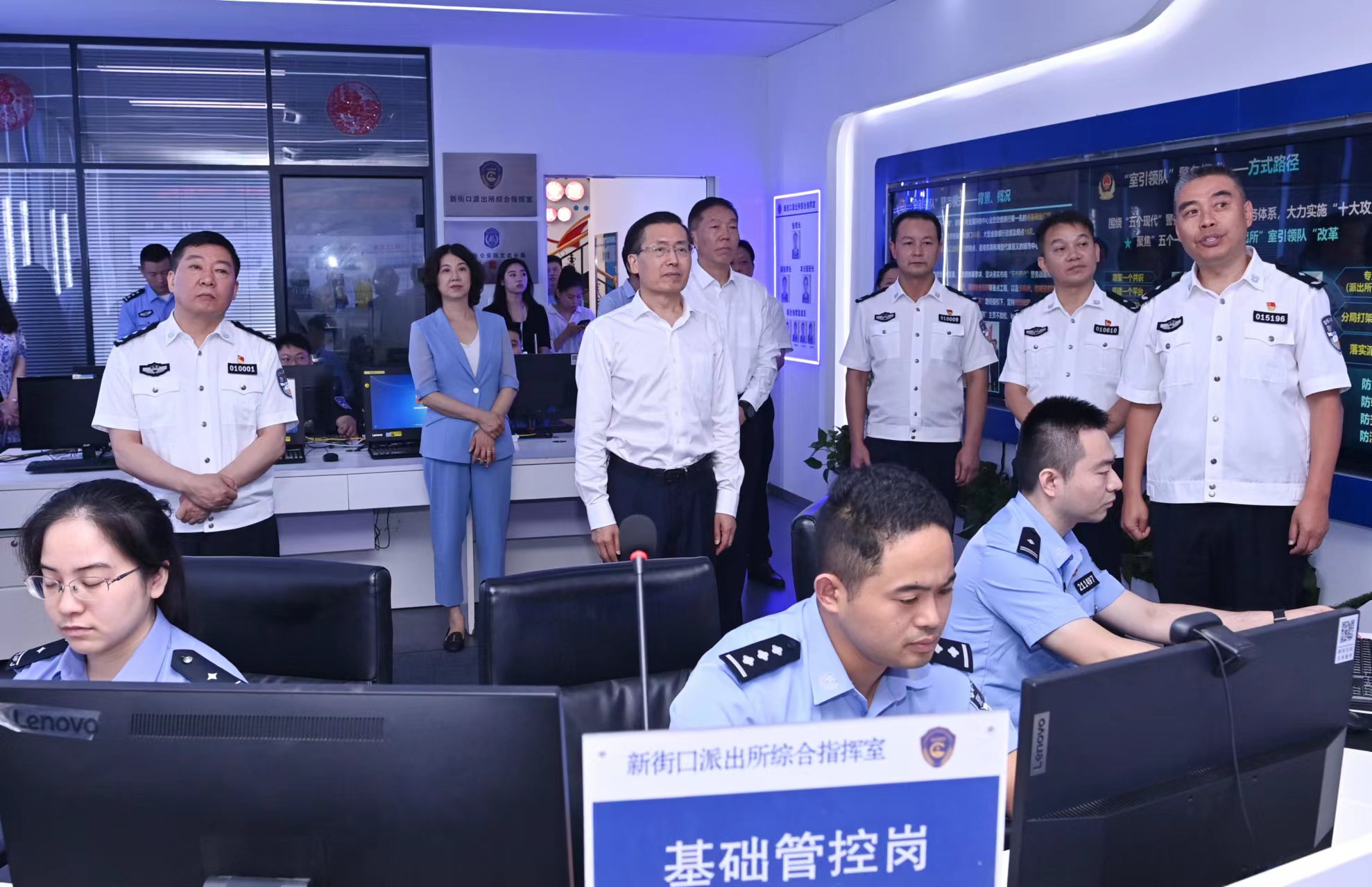 王立平一行到新街口派出所,实地察看值班大厅、综合服务窗口、综合指挥室、石榴籽工作室等,听取推动“派出所主防”实战体系建设、学习和发扬“枫桥经验”等方面工作情况介绍。到市公安局“合成服务中心”,了解该中心积极探索服务提质、工作提效的新思路新途径,以及为企业提供清单化、一体化、规范化的服务,努力构造营商环境新高地的相关成效。在市公安局情报指挥中心,逐一听取专班运行情况,随后召开座谈会。