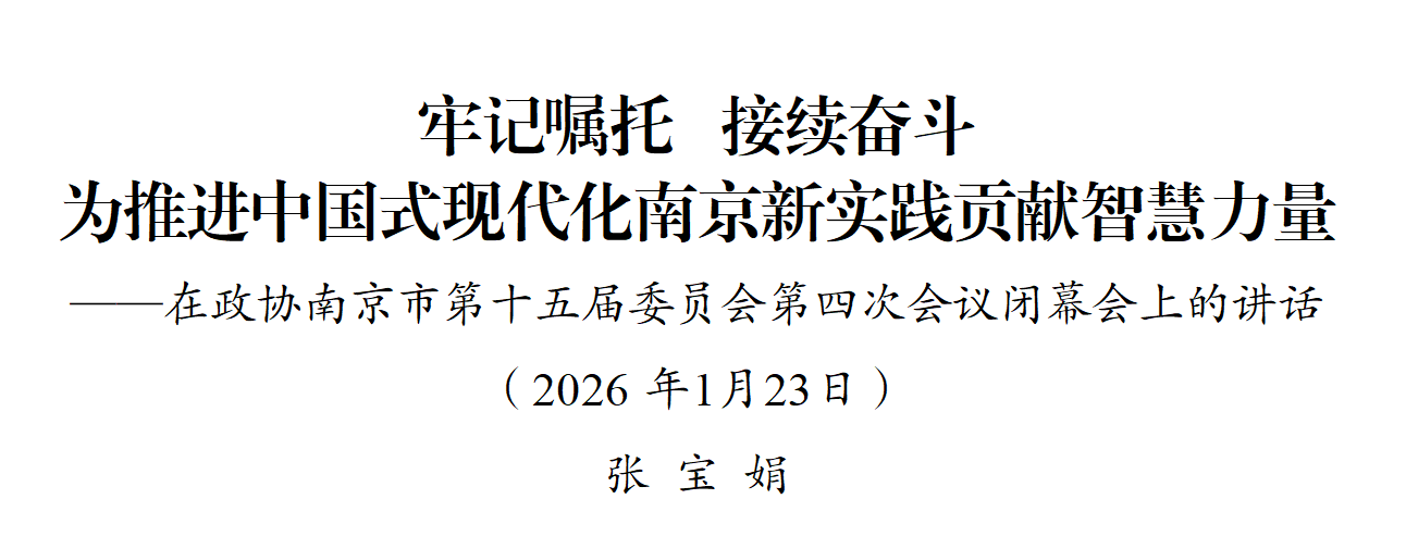 各位委员、同志们!近年来,习近平总书记多次对江苏工作发表重要讲话、作出重要指示,2023年7月亲临南京考察调研,饱含着对我们的深切关怀和殷切期待。2026年是“十五五”开局起步之年,做好今年工作意义重大。我们必须牢记嘱托、感恩奋进,深入贯彻习近平总书记对江苏工作、政协工作重要讲话重要指示精神,牢牢把握市委对南京“十五五”发展提出的“创新引领、文化赋能、枢纽提能、国际开放”四个战略重点,充分发挥专门协商机构作用,为谱写“强富美高”新南京现代化建设新篇章作出政协新贡献。